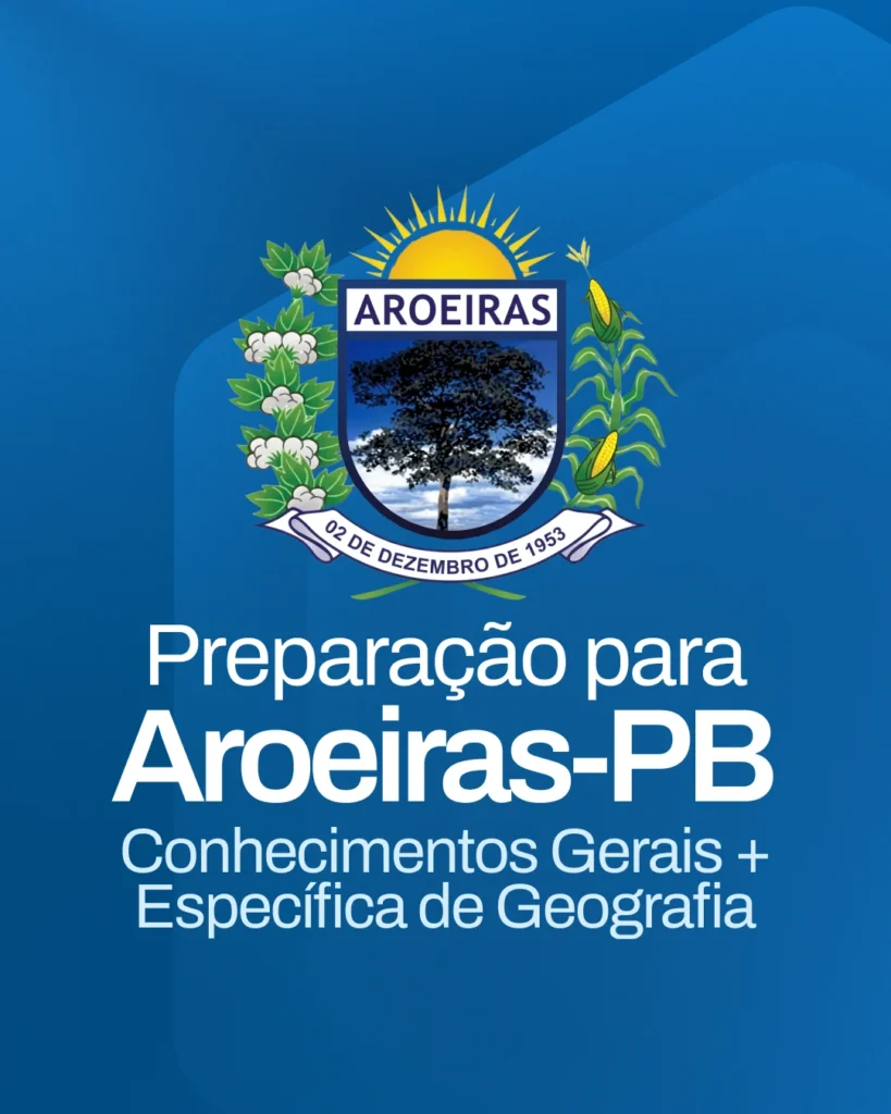 Este curso cobre a Parte Básica e os Conhecimentos Específicos de Geografia da Prova Objetiva do concurso de Professor Ensino Fundamental II (6º ao 9º ano) – Geografia da Prefeitura de Aroeiras-PB, com 1 vaga e remuneração de R$ 3.880,06 para jornada de 25 horas semanais.